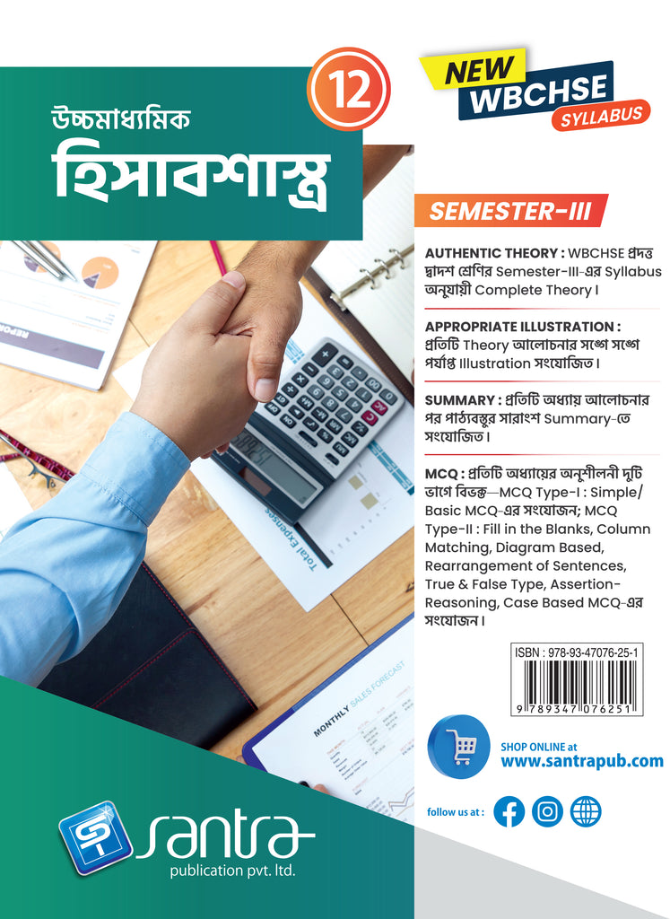 উচ্চমাধ্যমিক হিসাবশাস্ত্র– XII’ (সেমিস্টার 3) পশ্চিমবঙ্গ উচ্চমাধ্যমিক শিক্ষা সংসদ প্রবর্তিত নতুন পাঠ্যক্রম নতুন প্রশ্নকাঠামো (New Curriculum & Syllabus 2024) অনুসারে দ্বাদশ শ্রেণির ছাত্রছাত্রীদের জন্য তৈরি একটি পাঠ্যপুস্তক। এই পাঠ্যক্রম অনুযায়ী, এখন থেকে দ্বাদশ শ্রেণির পরীক্ষা দু-ভাগে হবেসেমিস্টার 3 এবং সেমিস্টার 4 তৃতীয় সেমিস্টারে সব MCQ প্রশ্ন থাকবে। এই বইটি শুধুমাত্র সেমিস্টার 3-এর জন্য প্রযোজ্য