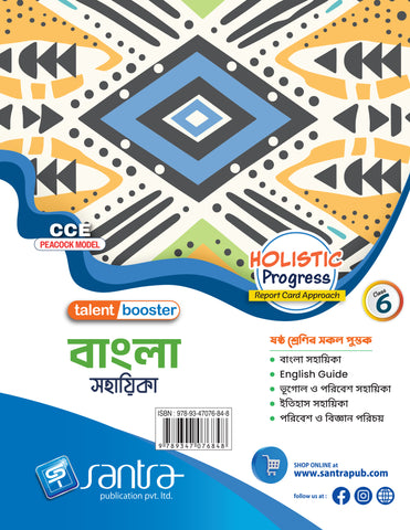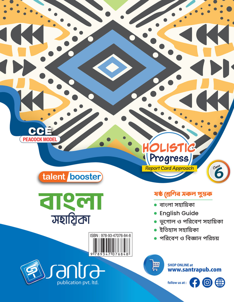 ‘বাংলা সহায়িকা – 6’ is a comprehensive guide for Bengali following the class VI WBBSE prescribed Bengali curriculum. The book acts as a reference support for all the Textual part (সাহিত্যমেলা), Supplementary Reader (হ য ব র ল) and বাংলা ব্যাকরণ ও নির্মিতি parts. Every chapter has been enriched with detailed study, analysis of the stories, poems and songs. Other than the solutions to textbook questions, ample additional question-answers have been provided keeping in mind the CCE pattern. The Grammar portion has all the rules described in brief with additional exercises for the purpose of practice. The book also includes model activity tasks, open ended questions, প্রস্তুতিকালীন (Mock test) and পর্যায়ক্রমিক মূল্যায়ন (Summative question papers). The book, if followed, will benefit students immensely.