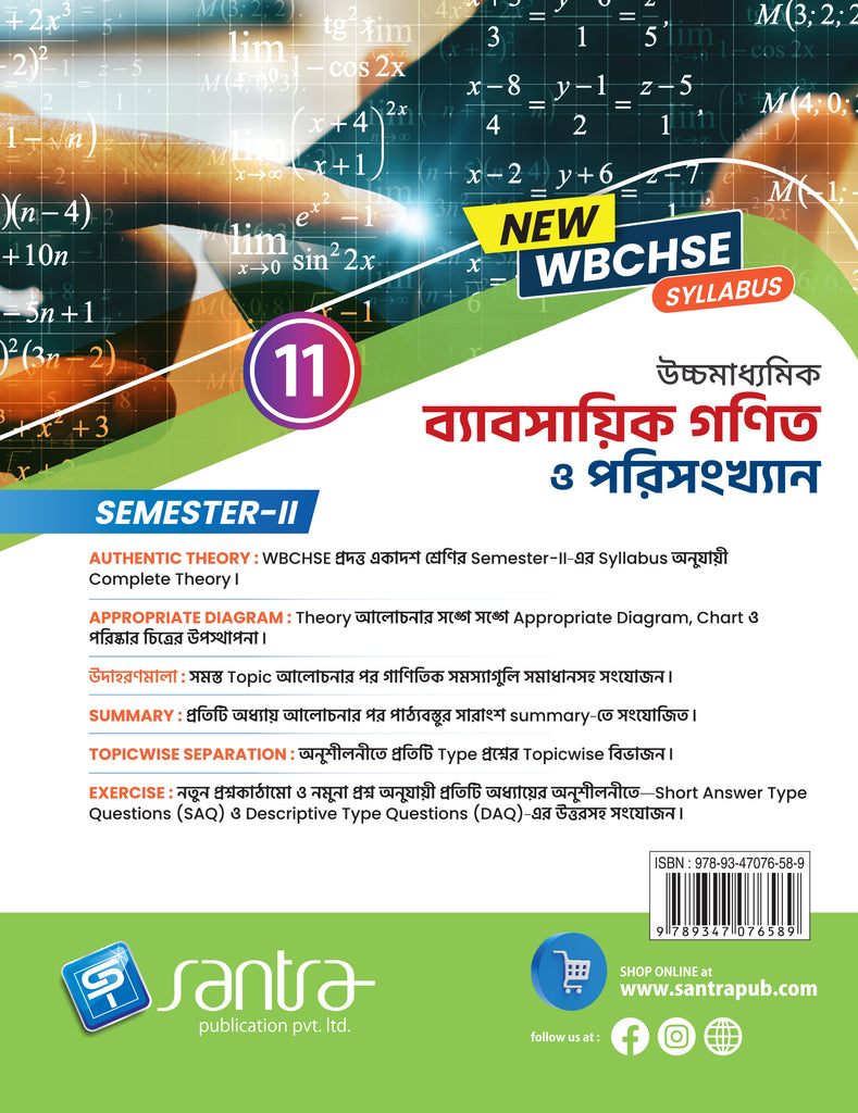 ‘উচ্চমাধ্যামিক ব্যাবসায়িক গণিত ও পরিসংখ্যান’ বা Business Mathematics and Basic Statistics পশ্চিমবঙ্গ উচ্চমাধ্যামিক শিক্ষাসংসদ (New Curriculum and Syllabus 2025) প্রবর্তিত নতুন পাঠ্যক্রম অনুসারে রচিত একাদশ শ্রেণির বাণিজ্য বিভাগের ছাত্রছাত্রীদের জন্য আদর্শ মানের পাঠ্যপুস্তক । একাদশ শ্রেণির পরীক্ষা এবার থেকে দু-ভাগে হবে: Semester 1 এবং Semester 2। এই বইটি Semester 2-এর ছাত্রছাত্রীদের জন্য।