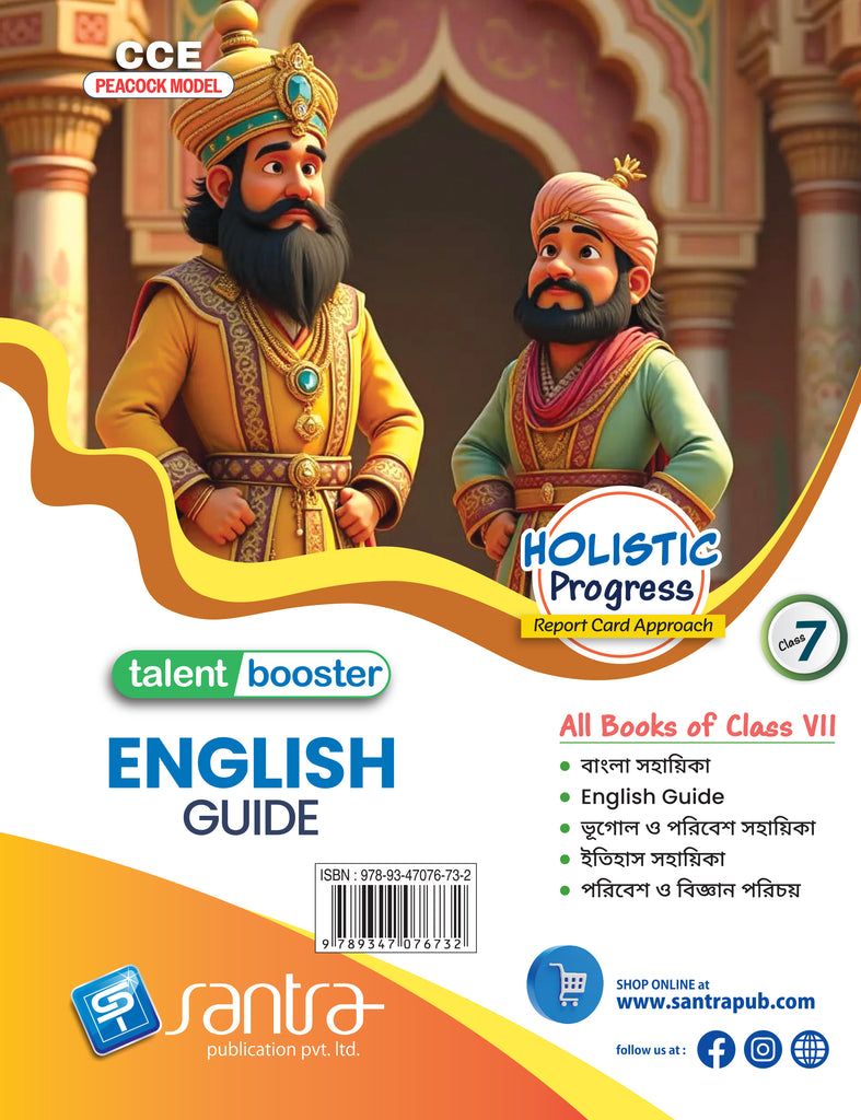 ‘English Guide -7’ is a comprehensive guide for the English - B (English Language and Literature) curriculum of class VII under WBBSE. English is a compulsory subject and hence needs proper understanding to score higher. This book is a reference support for the textbook provided by the Board. All the 13 Seen lessons have been presented in a thorough manner following the CCE pattern of question-answers. All the textbook Activities have been solved. Unseen passages with solutions have been provided. 15 Grammar lessons have been incorporated with proper rules and ample examples to provide clear understanding. 6 Writing lessons have been provided with numerous solved examples. Peacock Model has been included with examples for all the Indicators. Finally Summative Question Papers from several schools have been attached to help the students.