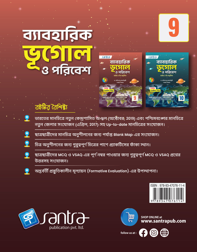 ব্যাবহারিক ভূগোল পরিবেশ পশ্চিমবঙ্গ মধ্যশিক্ষা পর্ষদ দ্বারা নির্ধারিত নতুন পাঠ্যক্রম অনুসারে লেখা একটি ব্যাবহারিক পুস্তক এটি এমন একটি বিষয় যাতে তাত্ত্বিক জ্ঞানের থেকে বেশি প্রয়োজন হয় অনুশীলন এই বইটিতে সবথেকে বেশি গুরুত্ব দেওয়া হয়েছে map pointing বা মানচিত্র অনুশীলনে মানচিত্র সম্পর্কে সঠিক জ্ঞানার্জনের জন্য প্রচুর চিত্র নতুন মানচিত্রর অবতারণা করা হয়েছে পশ্চিমবঙ্গের 23-টি জেলার বিভাগ দেখানো হয়েছে প্রাকৃতিক ভূগোলের ক্ষেত্রে চিত্র আনুশীলন এবং আঞ্চলিক ভূগোলের ক্ষেত্রে সম্পদ, মানচিত্রে স্থান নির্দেশনার নিয়মাবলি, ভারতের মানচিত্রসমূহ এবং পশ্চিমবঙ্গের মানচিত্রসমূহ আলোচনা করা হয়েছে এছাড়া রয়েছে MCQ VSAQ প্রশ্নোত্তর, বিষয়ভিত্তিক অনুশীলনী, মানচিত্র অনুশীলন, বিষয়ভিত্তিক অনুশীলনী অন্তর্বর্তী প্রস্তুতিকালীন মূল্যায়ন (IFE) এই বইটি ছাত্রছাত্রীদের ভূগোলের পাঠে আগ্রহ সৃষ্টি করবে এবং পরিক্ষায় ভাল ফল করতে সাহায্য করবে